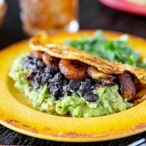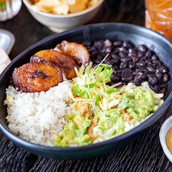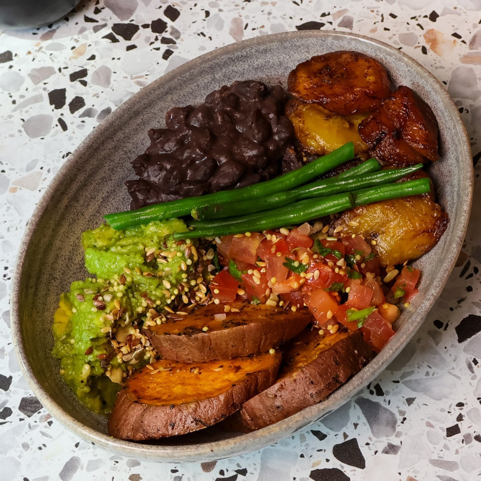 Mashed avocado topped with seeds mix, sweet potatoes topped with pico de gallo, creamy black beans and fried plantains.