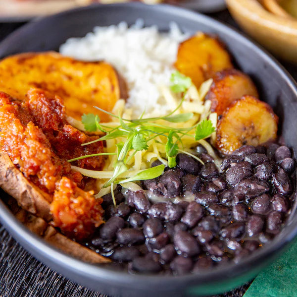 Shredded beef, creamy black beans and grilled sweet potatoes, pico de gallo and greens.