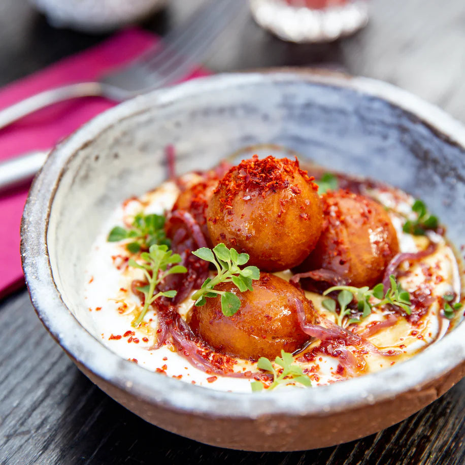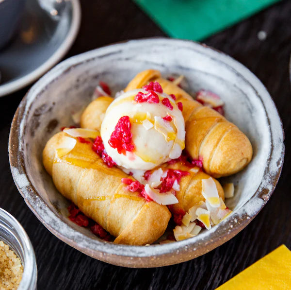 Three fried chocolate pastries served with vanilla ice cream and passion fruit coulis. (G) (V)