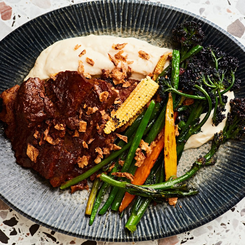 Traditional beef dish with a caramelised dark gravy, celeriac puree and mixed vegetables.