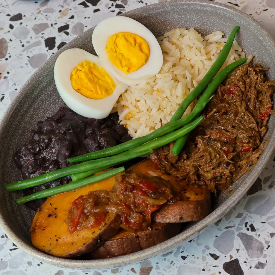 Double portion of shredded beef, black beans, grilled sweet potatoes, rice, boiled egg and greens.