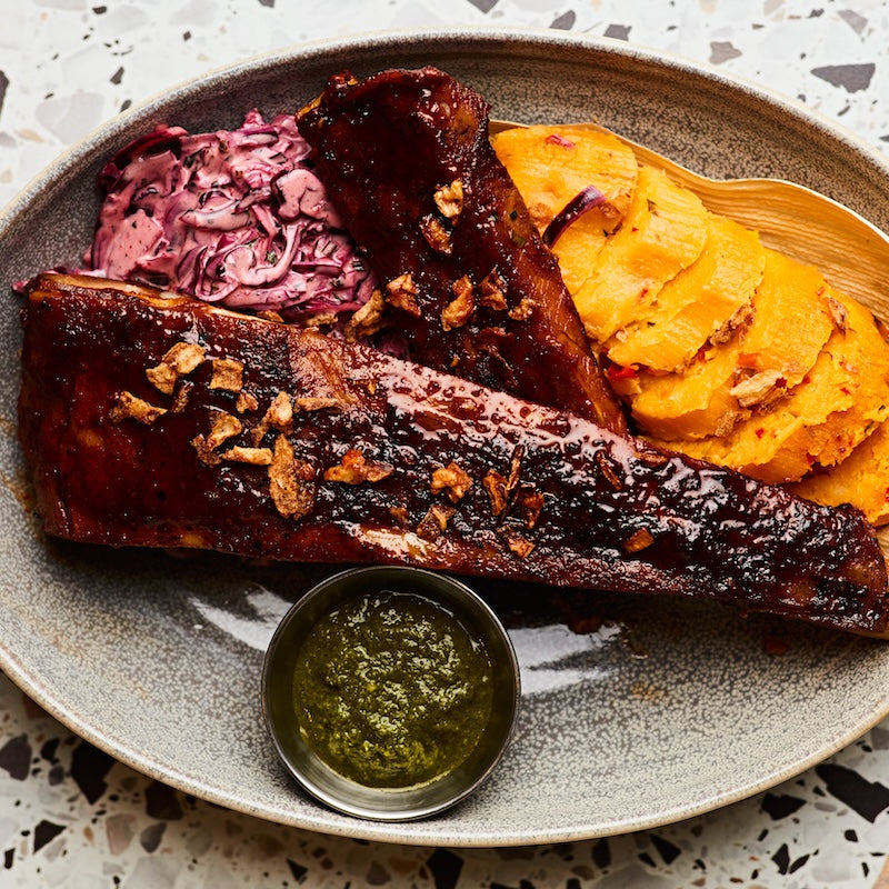 BBQ pork ribs served with celeriac puree, fruity coleslaw and seasoned corn on the cob.